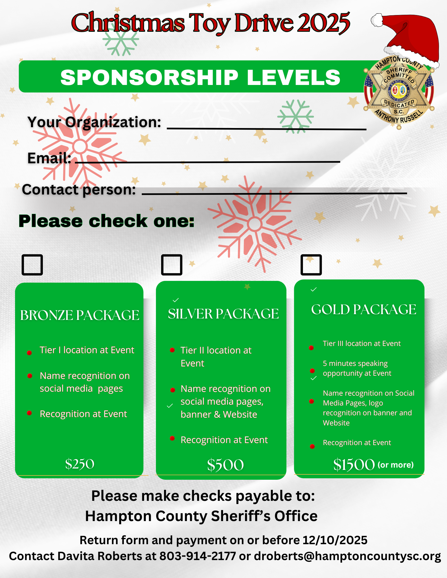 Each year, Hampton County Sheriff’s Office hosts Santa’s Wonderland, a community event that brings holiday joy to children and families across Hampton County. This celebration is made possible through the generosity of local sponsors, churches, and community partners.